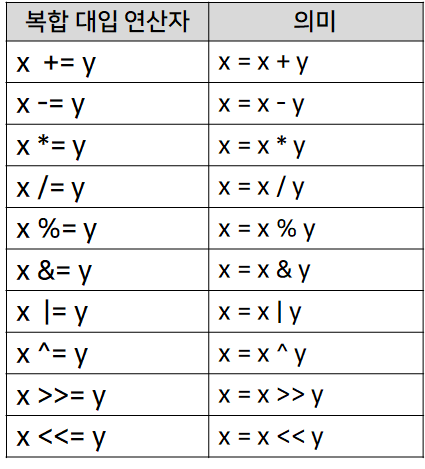 : 대입 연산자(=)와 산술 연산자(+-/*%)를 합쳐 놓은 연산자