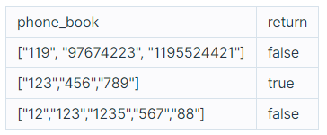 전화번호부에 적힌 전화번호를 담은 배열 phone_book 이 solution 함수의 매개변수로 주어질 때, 어떤 번호가 다른 번호의 접두어인 경우가 있으면 false를 그렇지 않으면 true를 return 하도록 solution 함수를 작성해주세요.
