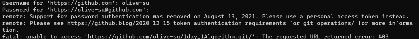 여느때와 다름없이 알고리즘 문제를 풀고 깃허브에 푸쉬하는 중에 위 같은 에러가 떴다,,