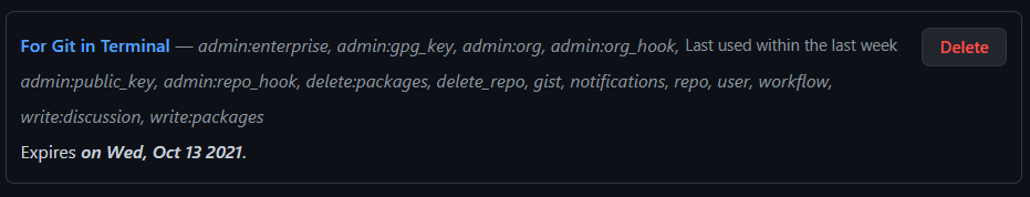 - 우측의 'Delete'버튼을 누르면 해당 토큰은 삭제가 되고 해당 토큰으로는 이제 더이상 깃에 접근할 수 없다.