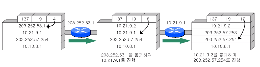 - 송수신 과정에서 각 루트 정보들을 누적하여 저장 → 다시 송신 반복