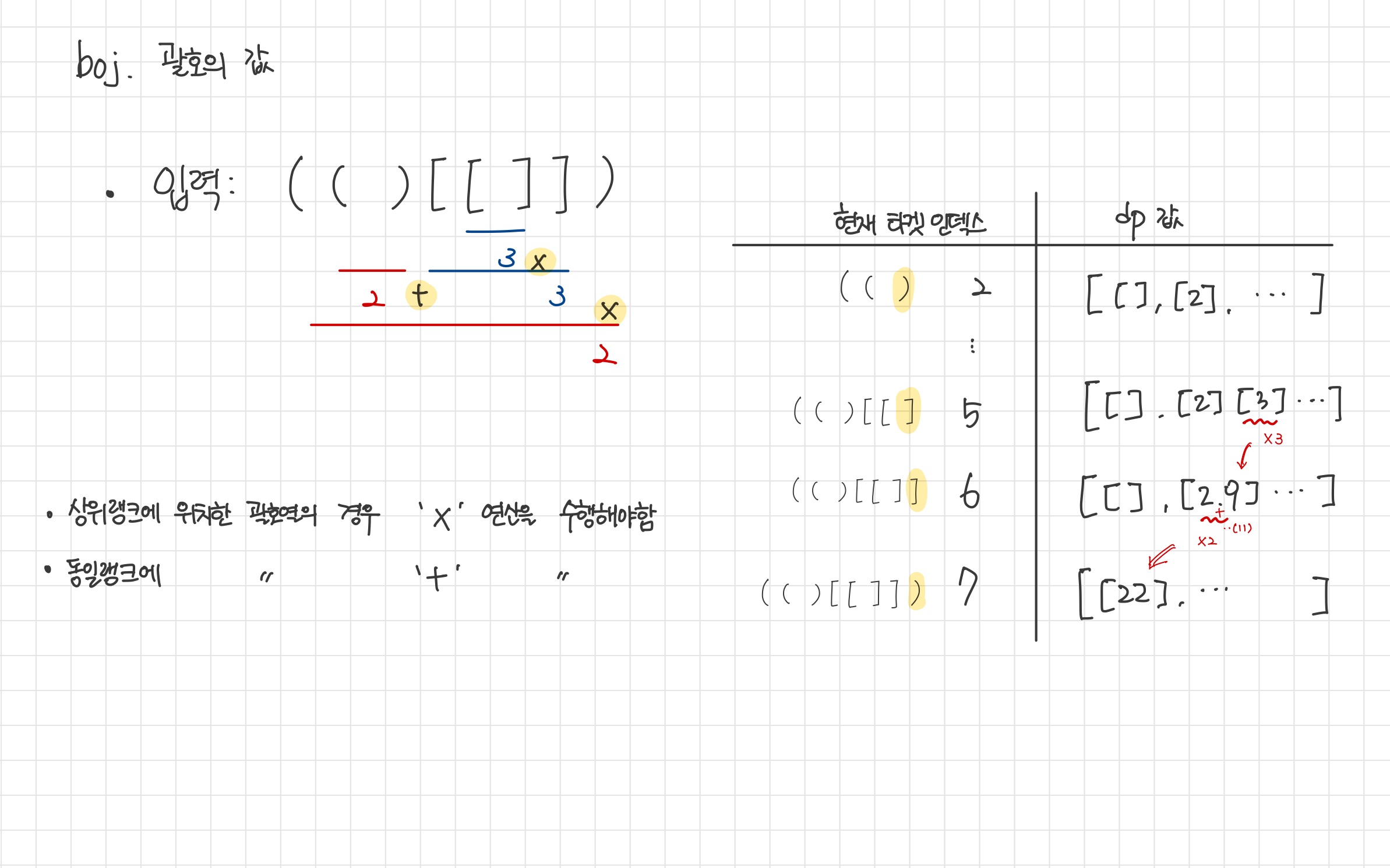 예를 들어 ‘(()[[]])([])’ 의 괄호값을 구해보자. ‘()[[]]’ 의 괄호값이 2 + 3×3=11 이므로 ‘(()[[]])’의 괄호값은 2×11=22 이다. 그리고 ‘([])’의 값은 2×3=6 이므로 전체 괄호열의 값은 22 + 6 = 28 이다.