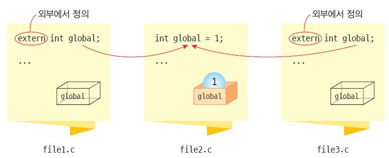 - 여러 개의 파일로 이루어진 경우, 하나의 전역변수를 여러 소스 파일에서 공유해야하는 데, 이때 하나의 파일에서 전역변수를 선언하고 다른 파일에서는 extern 지정자를 이용하여 이 변수를 참조하게 한다.