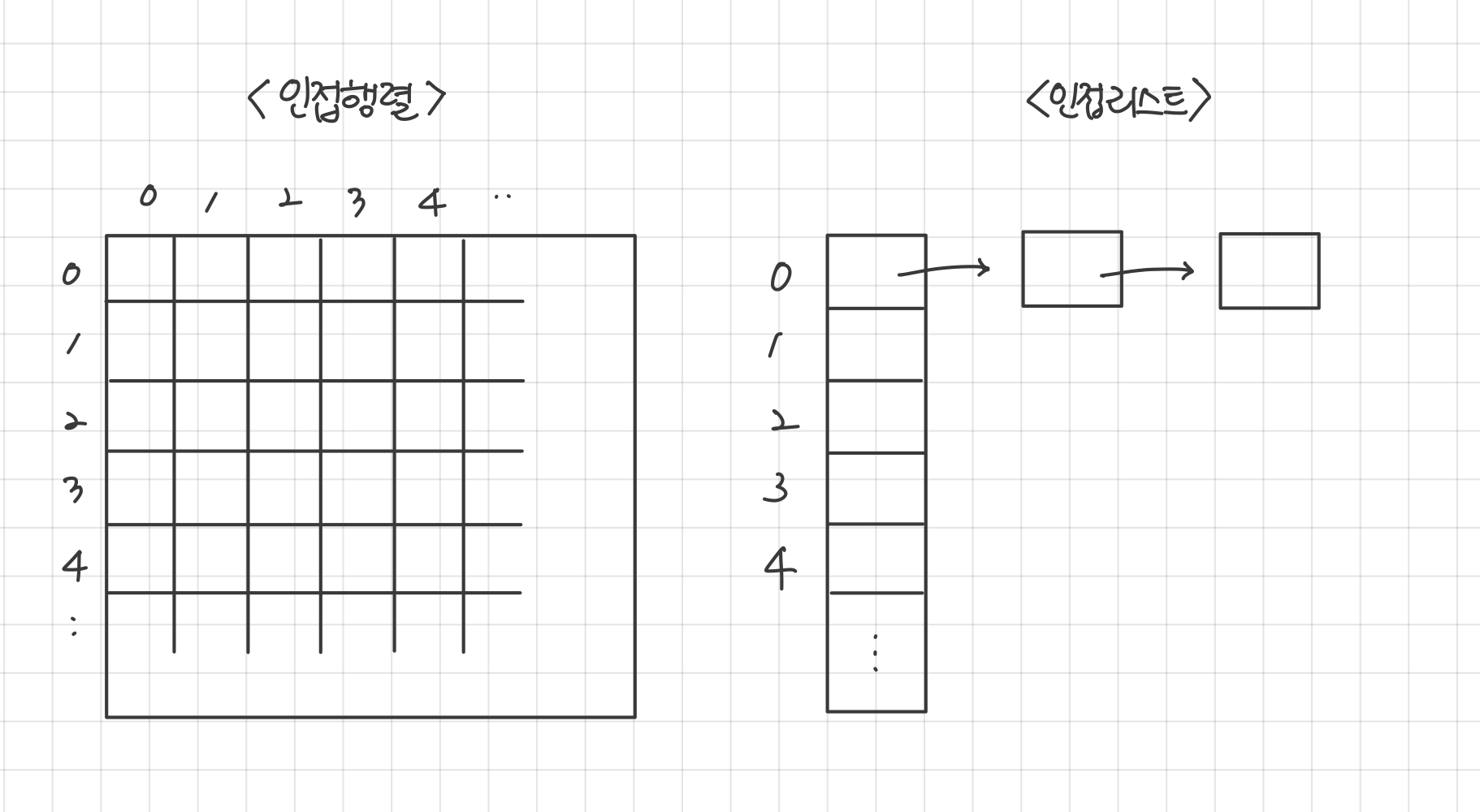 - 인접 행렬(adjacency matrix) : 연결되어 있을 경우 1, 0