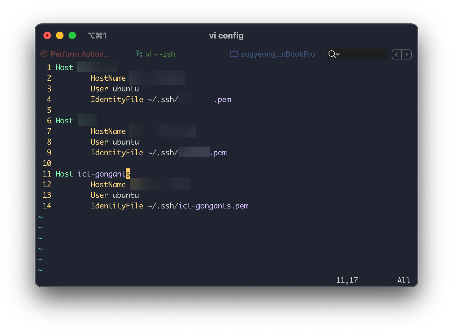 Host {지정 이름} HostName {호스트 주소 - ec2 퍼블릭 IPv4 주소 or 퍼블릭 IPv4 DNS} User {유저 네임 - ec2-user} IdentityFile {키 파일 위치} Port {포트 번호} - ec2 user name 참고