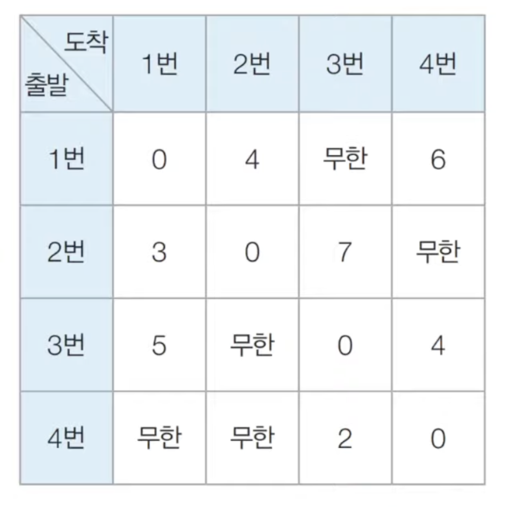 - 최단 거리 테이블 : 행은 출발 노드, 열은 도착 노드를 의미