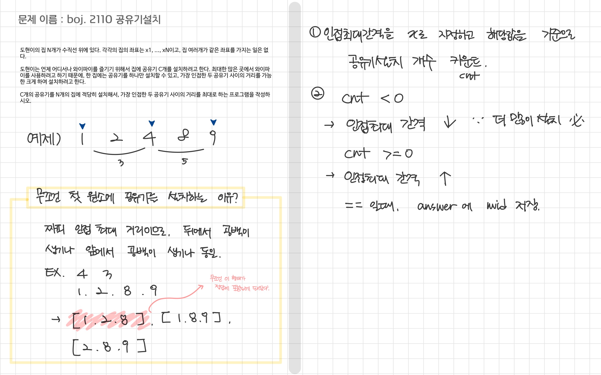 - 해당 간격을 기준으로 공유기를 설치했을 때, 설치할 수 있는 집 개수를 카운트한다.
