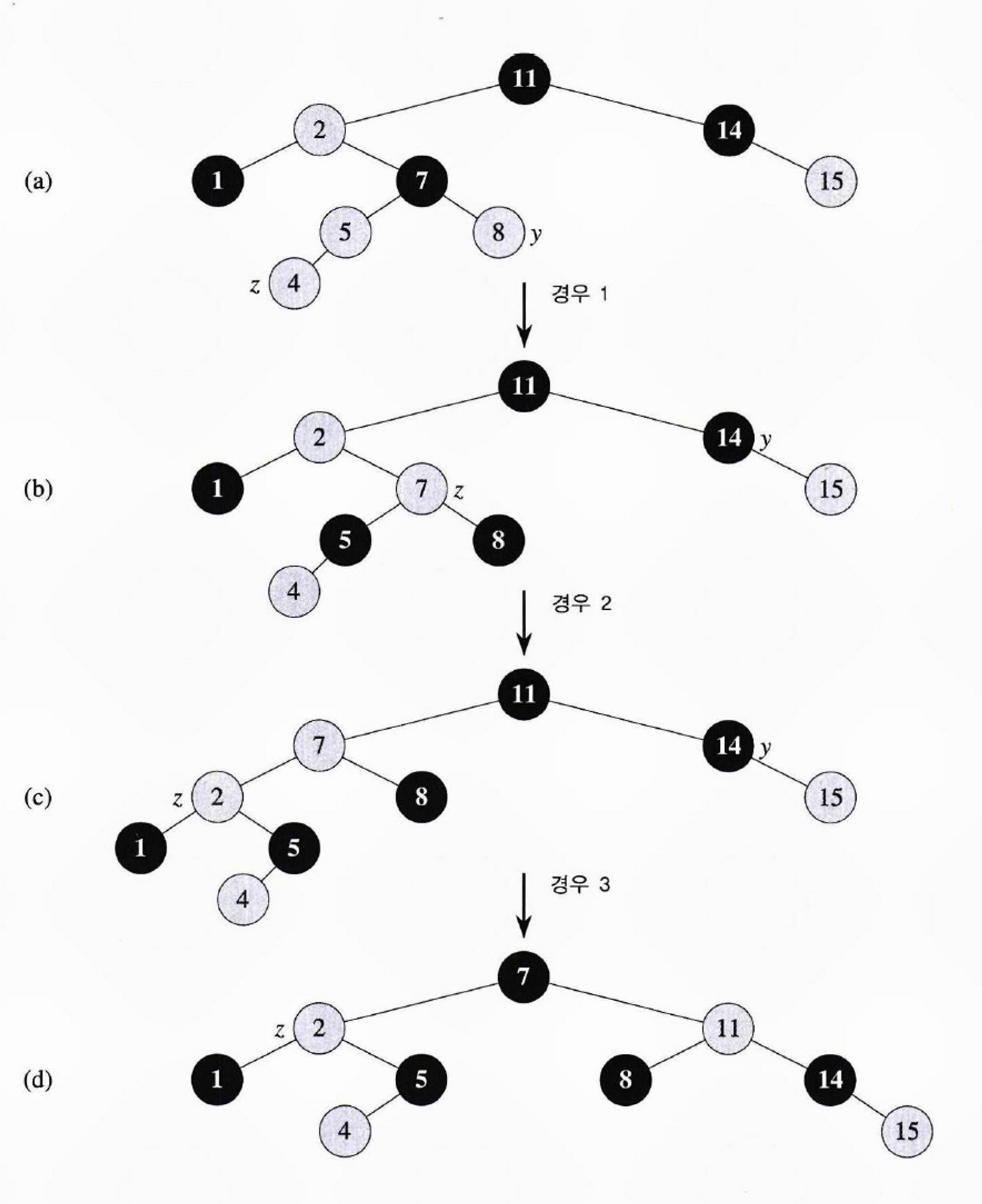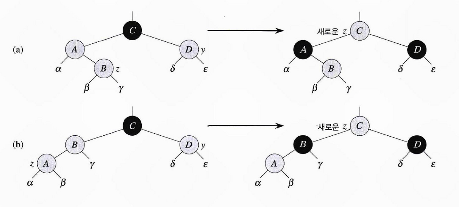 - 설명 : 새로 노드를 삽입하는 과정에서 발생하는 규칙 위반을 교정한다.