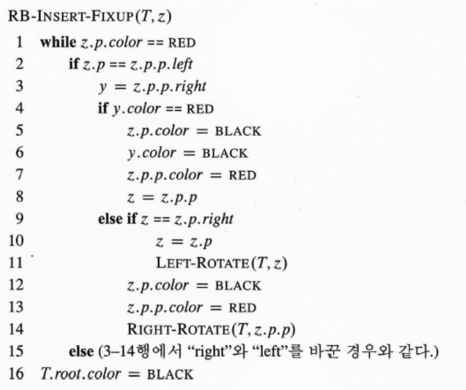 z -> parent가 레드일 때만 루프 수행하므로 while루프 내에서 특성 4를 위반하는 지 판단한다.- 총 6가지 경우에 대해서 판단을 하면 되는데, ‘조부모-부모’가 ‘왼쪽-오른쪽’의 경우가 대칭된다.