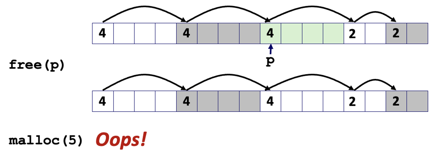 - 할당한 블록을 반환할 때, 인접한 다른 가용 블록들이 있을 수 있다.
