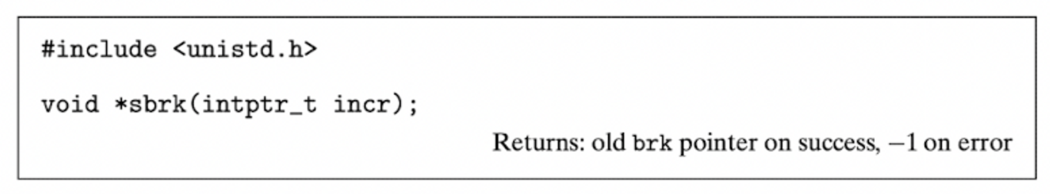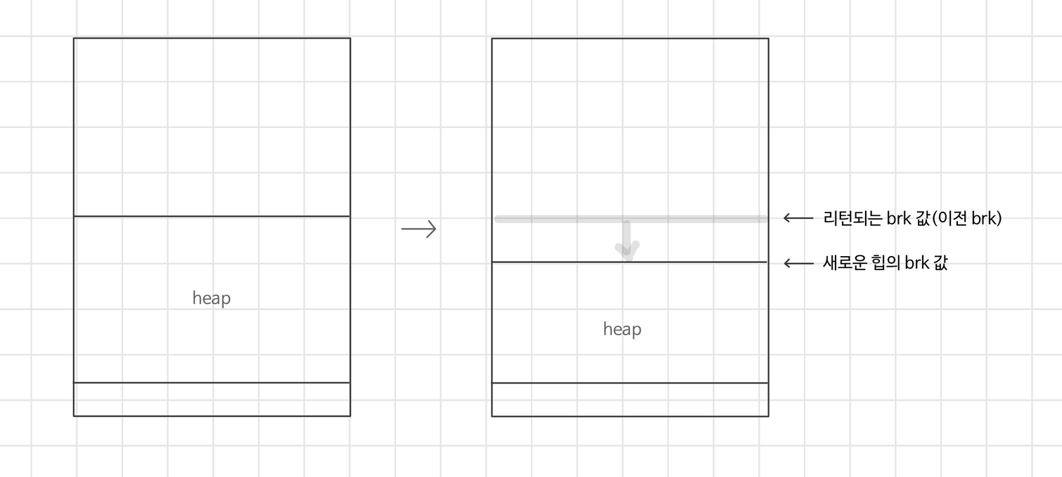 brk포인터에incr를 더해서 힙을 늘이거나 줄인다.- 성공 시, 이전