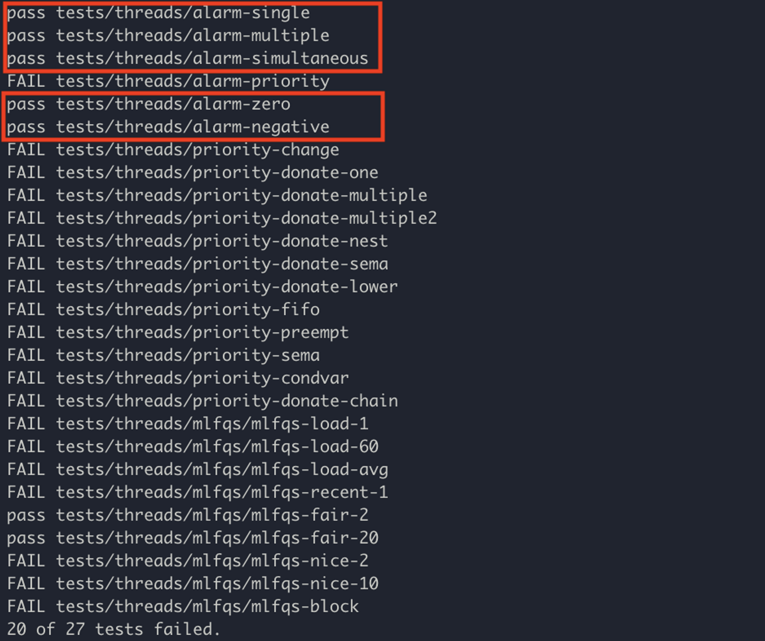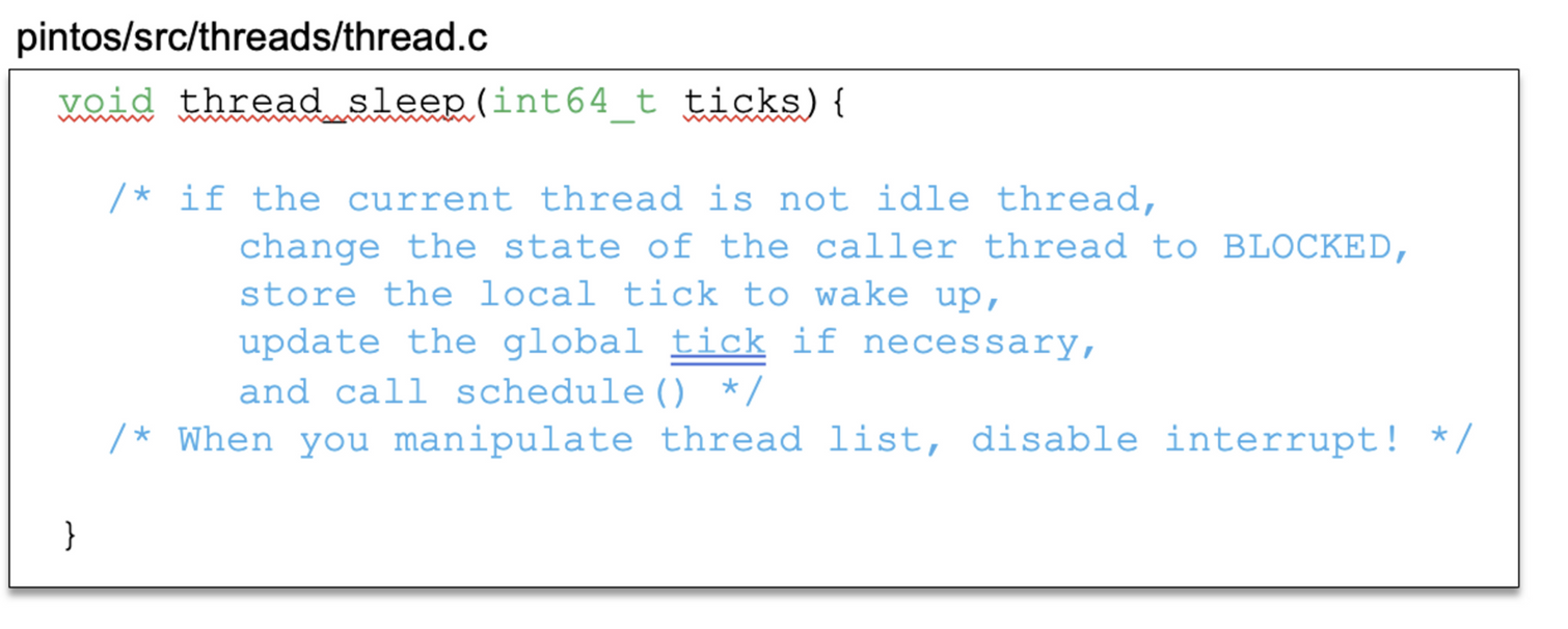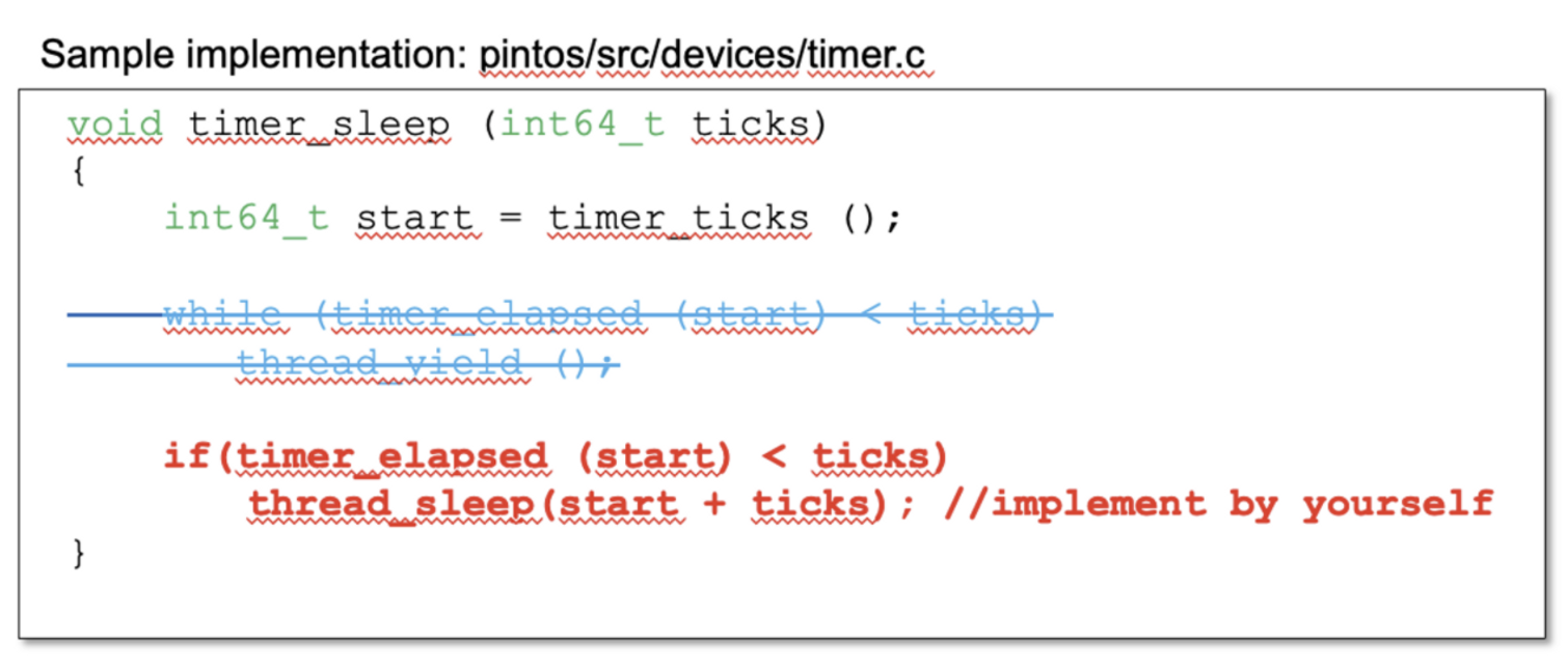 - 'devices/timer.c' 에 정의된 'timer_sleep()' 을 재구현하라.