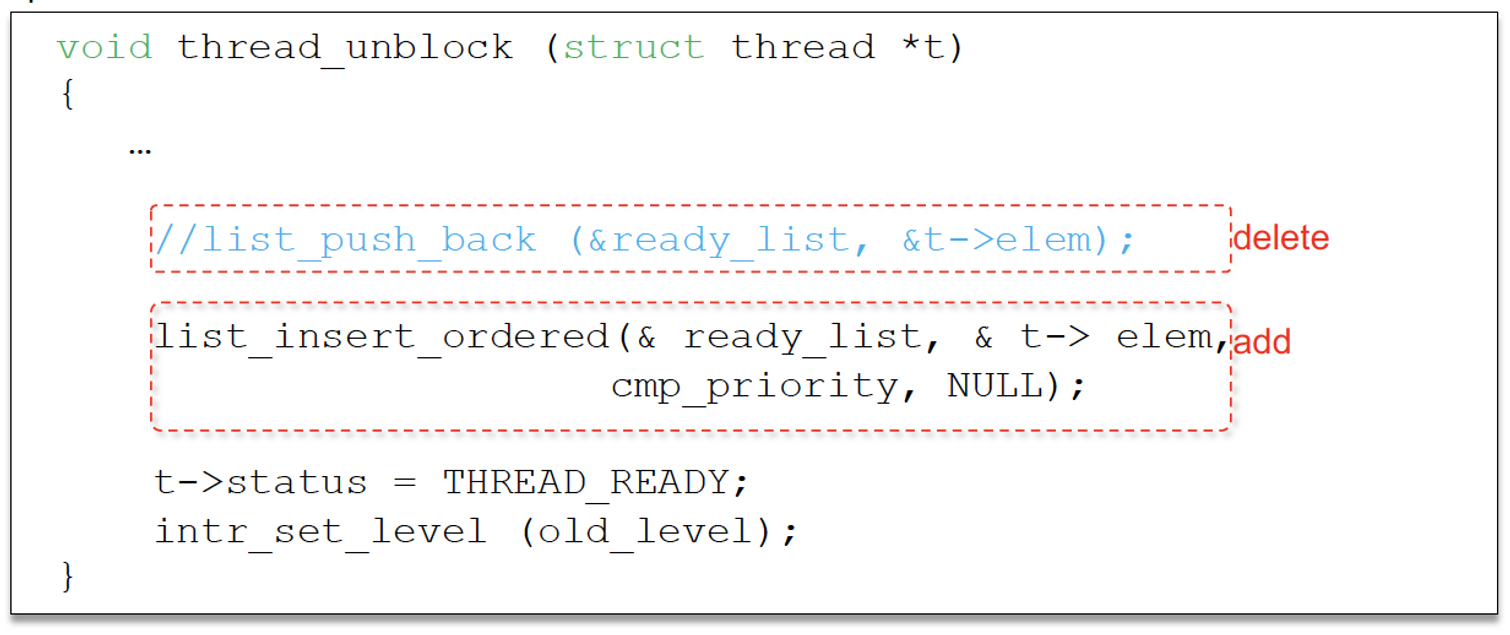 - unblock될 때 우선순위 순으로 정렬되어 ready_list에 삽입되도록 수정한다.