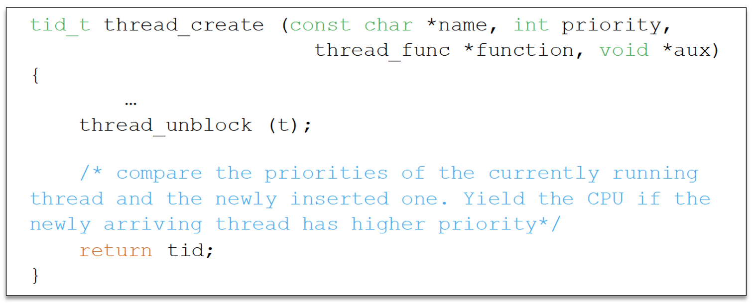 - 'threads/thread.c' 에서 'thread_set_priority' 와 'thread_get_priority' 를 구현하라