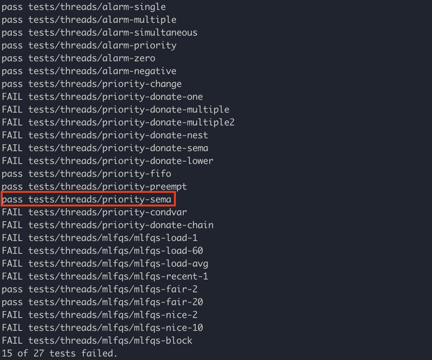 - semaphore 를 얻고 waiters삽입 시, 우선 순위대로 삽입되도록 수정한다.