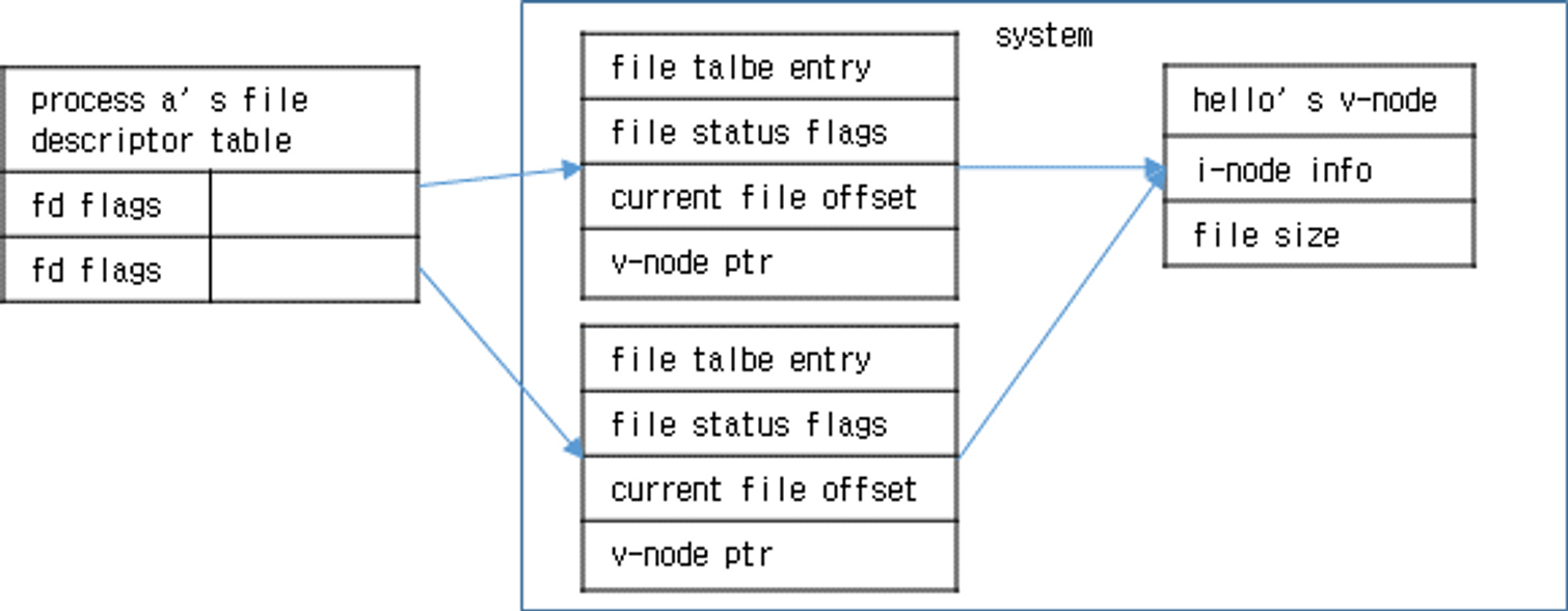 - 파일 디스크립터는 프로세스 당 하나 존재하며, 열려 있는 파일에 대한 파일 테이블 엔트리는 커널에 존재한다. 각 프로세스 당의 작업이 다르므로(작업 현황 R/W) 파일 테이블 엔트리도 각각 생기게 되는 것 같다.