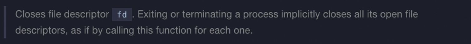- 프로세스를 종료하거나 제거하는 것은 묵시적으로 해당 프로세스에 열려있는 모든 fd를 닫는다.
