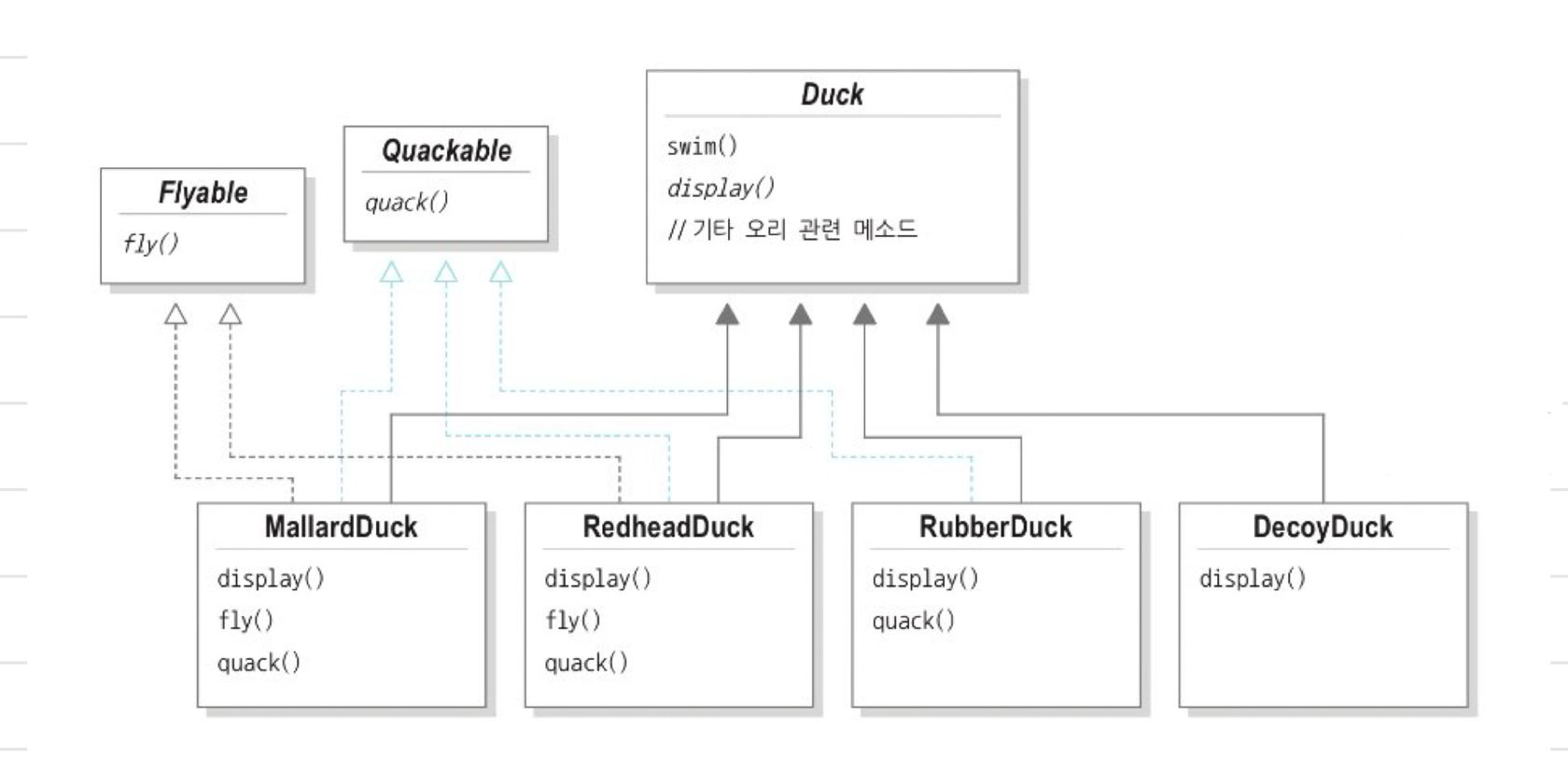 fly()/quack()Duck 클래스로부터 오리 종류에 따라 달라지도록 분리하고 클래스 집합을 새로 만든다.
