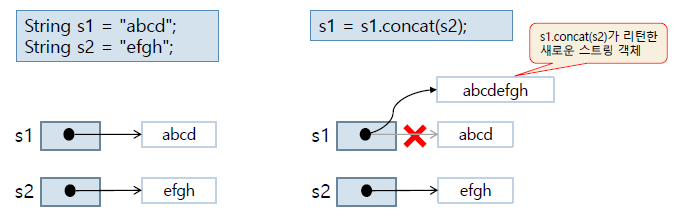- 기존 String 객체에 연결되지 않고 새로운 스트링 객체를 리턴한다.