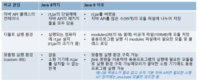 - 자바 API 의 모든 클래스가 여러 개의 모듈로 재구성된다.