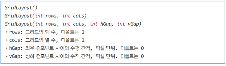 - 생성자에 행수와 열수를 지정하여 격자를 구성